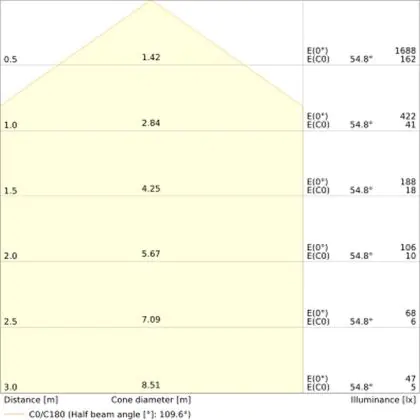 De lichtopbrengst (Lumen), geeft weer hoe krachtig het uitgestraalde licht is. Dit is belangrijk om te weten om de juiste sfeer te creëren. 0 tot 400 Lumen is bij uitstek geschikt voor accent- of sfeerverlichting. Een hoger aantal Lumen is, afhankelijk van de grootte van de ruimte, beter geschikt als ondersteunende- of basisverlichting. Heb je plafonds hoger dan 4 meter, dan is een lichtopbrengst van minimaal 8000lm aan te raden indien heldere verliching gewenst is (vb. in werkomgevingen).