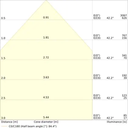 De gradenbundel geeft informatie over hoe breed het licht wordt uitgestraald. Dit zit tussen de 0 en 360 graden (D). Hoe kleiner de hoek, hoe specifieker de lichtbundel is. Over het algemeen is een smalle gradenbundel perfect voor sfeer- of accentverlichting, terwijl een brede gradenbundel ideaal is om grote oppervlaktes te verlichten.