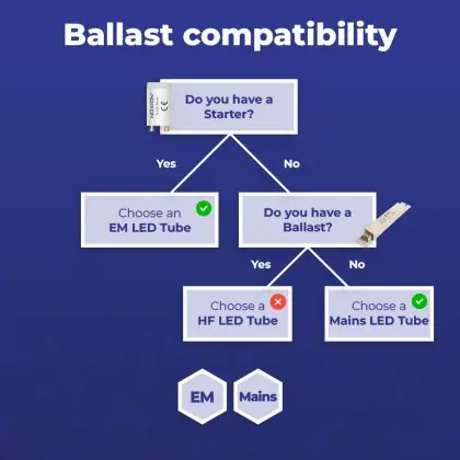 Je hebt een LED starter nodig wanneer de TL verlichting in je huidige armatuur ook een starter bevat. In dat geval gaat het om een armatuur met een conventioneel voorschakelapparaat (EM). Een LED starter vervangt je huidige starter en zorgt ervoor dat een LED TL Buis werkt.
