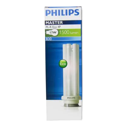 De Philips PL-R Eco 4P zijn bijzonder geschikt voor ruimtes waar verlichting dag en nacht brand. De Philips PL-R Eco 17W 830 4P (MASTER) lamp heeft een lengte van 15 cm en heeft een GR14q-1 lampvoet, wat overeenkomt met 4 pinnen. De lamp is met energielabel A is geclassificeerd. De lampen hebben een zeer lange levensduur, namelijk 24000 branduren!